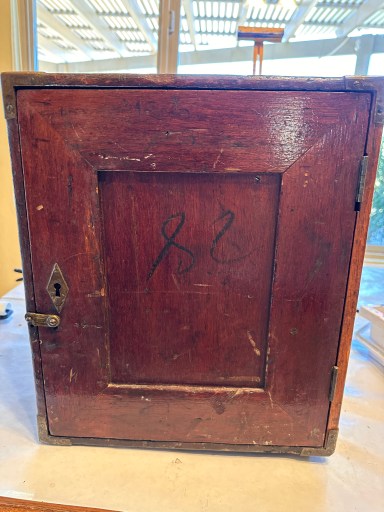 Removed the center panel of the door and added a painting of a transit to it. I kept painting fairly rough to go with the age of the box. The door itself had some damage which I repaired.